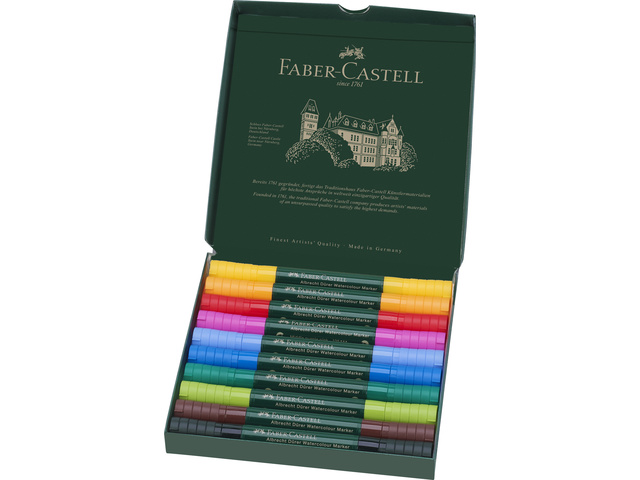 Faber-Castell Albrecht Dürer aquarelmarkers op waterbasis zijn de moderne definitie van aquarelleren, een hoge kwaliteit tekeninstrument dat zowel spontaan schetsen als aquarelleren ondersteunt. De inkt op waterbasis is altijd klaar voor gebruik en is uitstekend bruikbaar in combinatie met water.